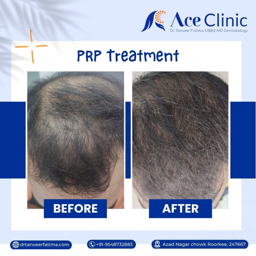 In platelet-rich plasma therapy, your body’s natural growth factors are harnessed to rejuvenate hair follicles and promote hair growth. When you visit ACE Clinic, you will find the best dermatologists in Roorkee. At ACE Clinic, a specialist collects blood and spins it in a centrifuge to extract PRP. Using this method, plasma is separated for therapy.